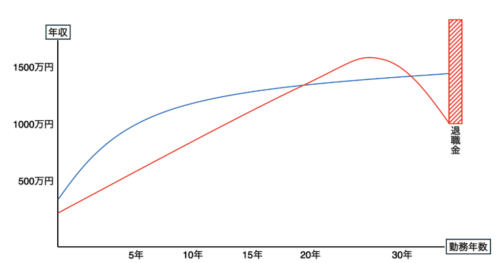 給与体系の仕組みから、若いうちにたくさんお金をもらって、高齢になってもあまり給与が増えない。